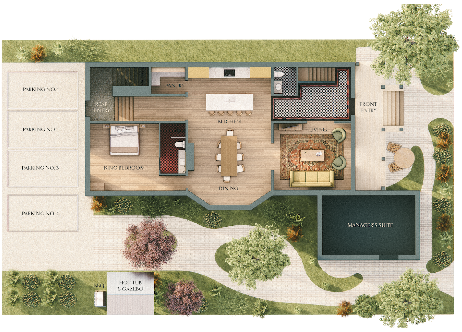 The Main Level of Samson House features a thoughtful and inviting layout. It includes a front entry, powder room, spacious living and dining areas, and a fully equipped kitchen. A private king bedroom with full ensuite provides main-floor comfort. At the back, a rear entry leads directly to four dedicated parking stalls, offering added convenience for guests.