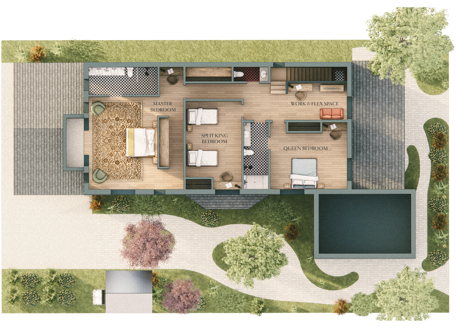 The Upper Level of Samson House offers a comfortable and flexible layout for families or groups. It includes a king primary bedroom with a private ensuite and Juliet balcony, a queen bedroom with access to a shared ensuite, and a third bedroom with two king single beds. A dedicated work and flex space provides room to focus or unwind, and an additional powder room adds convenience.